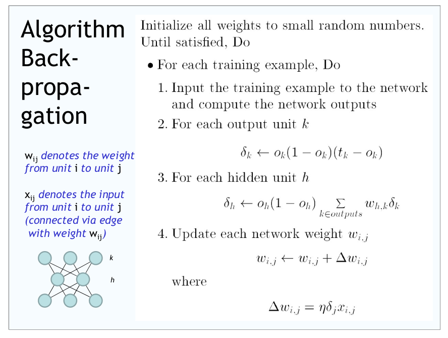 Backpropagation läuft in dieser Implementierung in zwei Schritten ab und orientiert sich an folgender Algorithmenskizze (dies zeigt nur den Spezialfall sigmoider Aktiverungsfunktion und muss bei beliebiger Aktivierungsfunktion die Ableitung eben dieser nutzen statt des o_k* (1- o_k) )